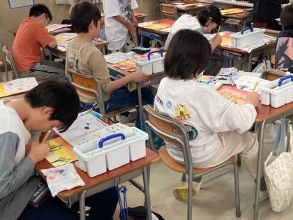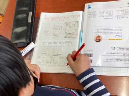 図画工作は夕焼けを描いた後、夕焼けに映える木を黒色で描きました。魔法の世界のような木があったり、創造力豊かに表現していました。算数は「長さ、面積、体積の単位どうしの関係」を考えました。面積も体積も長さの単位がもとになっていることがわかりましたが、少し難しいです。