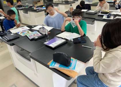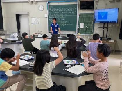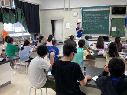 6年生が理科「ヒトや動物の体」を学習しています。人は空気を吸ったり息を吐き出したりする時に、何を出しているかを調べました。石灰水の入ったビニル袋に息を吐き出し、袋を振ってみると石灰水が白くにごりました。石灰水が白くにごるのは、二酸化炭素が加わったためだとわかりました。