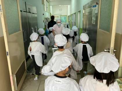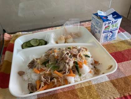 給食室では給食調理員さんが、食器や牛乳かご、食缶を児童に手渡ししてくれています。ありがとうございます。