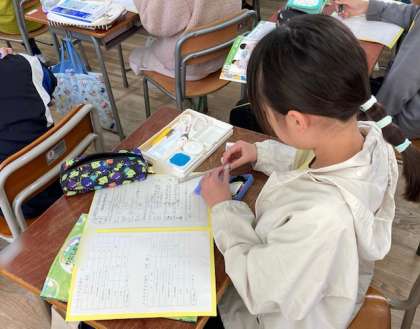 5年生が、家庭科「ソーイングはじめの一歩」を学習しています。今日は裁縫用具について調べました。裁縫する時は、針の数を使い始めと使い終わりに数えて記録します。