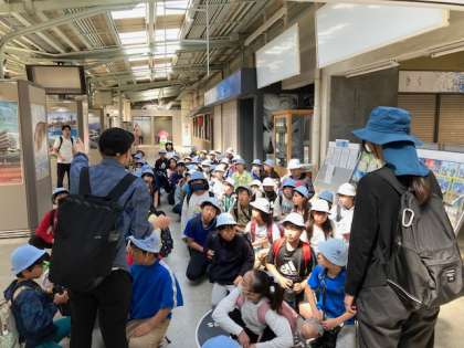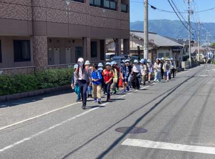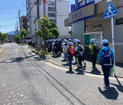 6年生が遠足で甘樫丘に行きます。橿原神宮前駅を出発して甘樫丘を目指しています。