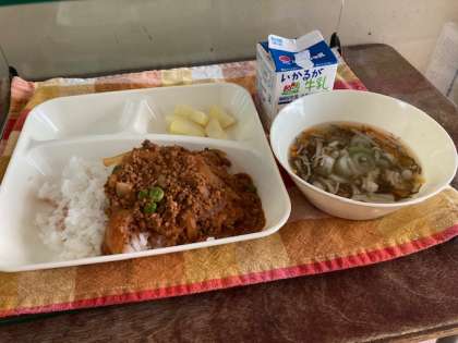 献立は、タコライス、もずくのスープ、焼きじゃが、ご飯、牛乳です。