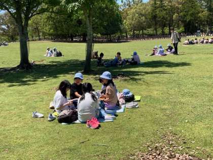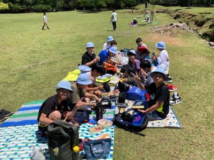 無事に全グループがゴールしました。楽しみのお弁当タイムです。自然の中でおいしくお弁当をいただきます。