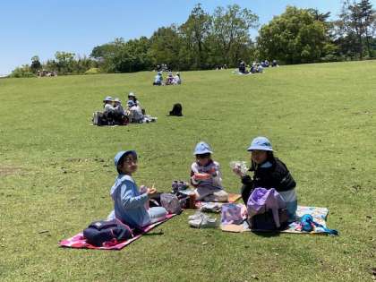 木陰で食べると風が心地よいです。みんな食欲あります。