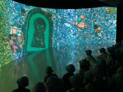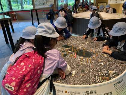 杉本町駅で長い時間停車しましたが、予定より5分遅れで、百舌鳥古墳群ビジターセンターに到着しました。古墳の展示物や堺市の街並みを撮影した空撮映像を見ました。