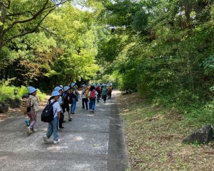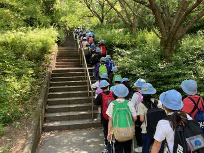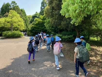 鶴見緑地公園では、まず風車の丘をめざして歩きました。木陰は涼しいですね。