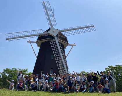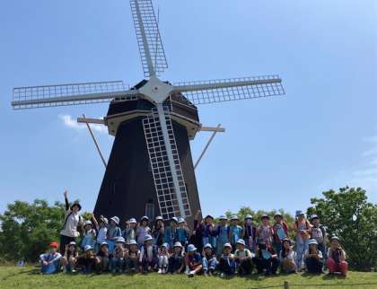 風車の丘で記念撮影です。さわやかな風に風車がまわっています。
