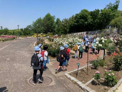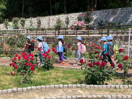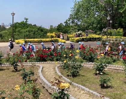 バラ園を通りました。赤、ピンク、黄色など、色々な種類のバラが咲いていました。