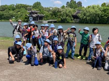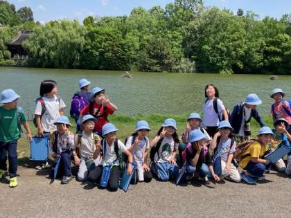 咲くやこの花舘をめざして歩いています。途中の池の前でサギに出会いました。