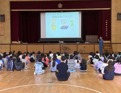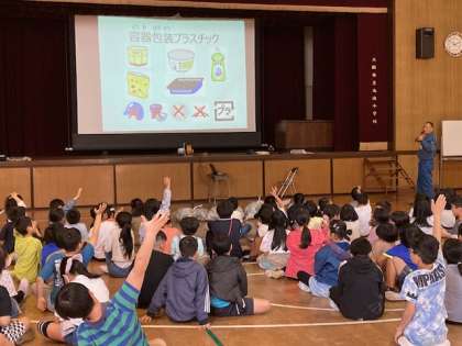 4年生が環境事業局の方に来ていただき、パッカー車体験をしました。まず、体育館でゴミの分別などについて教えてもらいました。