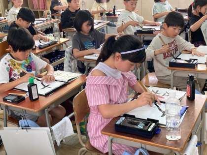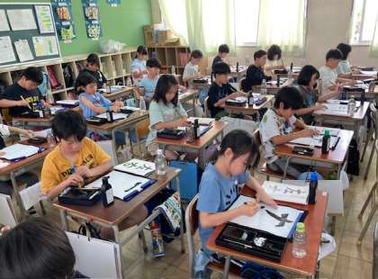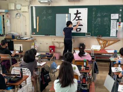 4年生が習字で、筆順と字形に気をつけて「左右」を書きました。左と右の一画目が違うことや左右の中心線に気をつけて書きました。