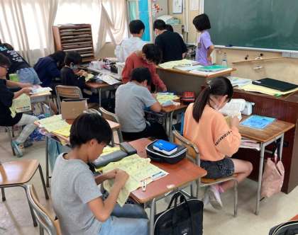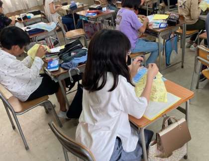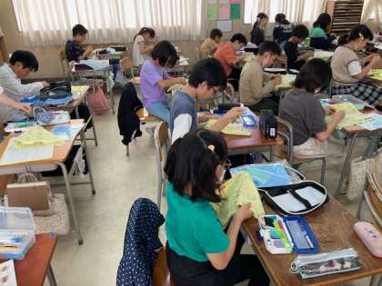 5年生が練習布を使って玉どめ、玉結びをしました。なかなか難しいですね。できた児童はミニ先生になり、友だちに教えていました。ご家庭でも玉どめ、玉結びの練習をお願いします。