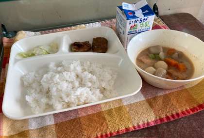 献立は、ちくわのいそべあげ、あつあげとさといものみそ煮、あっさりキャベツ、ご飯、牛乳です。