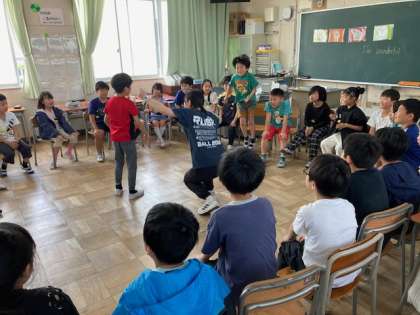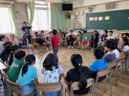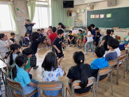 楽しく英語に触れ合えるように、sleepy、hungry、happy、fain、I'm wanderfulの言葉を言ってフルーツバスケットをしました。楽しいので、恥ずかしがらずにとても元気な声で発音していました。