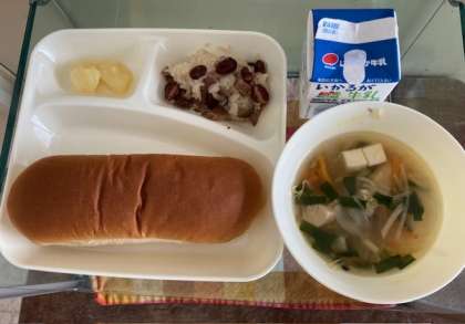 献立は、金時豆の中華おこわ、中華スープ、パインアップルの缶詰、黒糖パン、牛乳です。