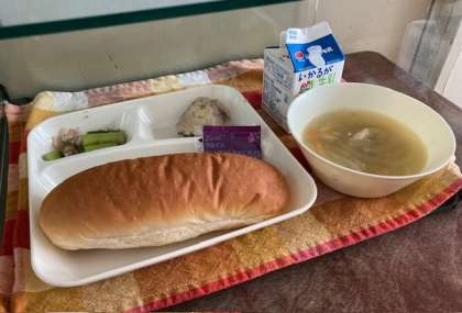 献立は、かつおのガーリックマリネやき、おしむぎのスープ、グリーンアスパラガスのソテー、コッペパン、ブルーベリージャム、牛乳です。グリーンアスパラガスは春の野菜です。かつおは、赤色のグループの食べ物で主に体を作る働きがあります。