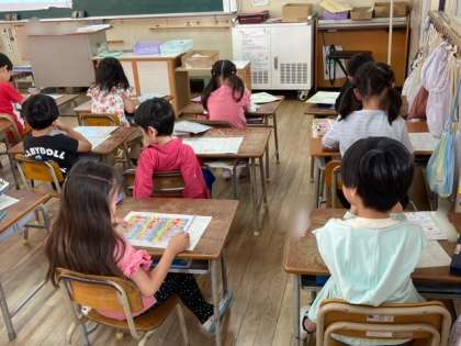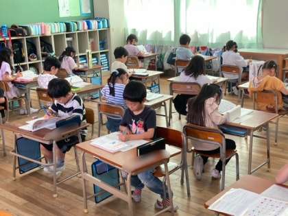 1年生が担任の先生と一緒に国語のテストをしました。先生が一問ずつ問題を読み、全員が解答したら、次の問題を読みあげます。まだ、ひらがなを習っている途中ですので、問題文を読めないからです。ひらがなを習い終わるまでは、先生と一緒にテストをします。