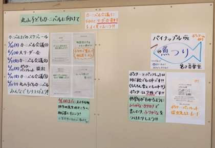 また、6年生が中心となる丸山カーニバルのスケジュール、ポスター、ゲームの企画書などの説明が掲示されています。6年生は学習にしっかりと取り組み、たてわり班のリーダーとしても活躍しています。