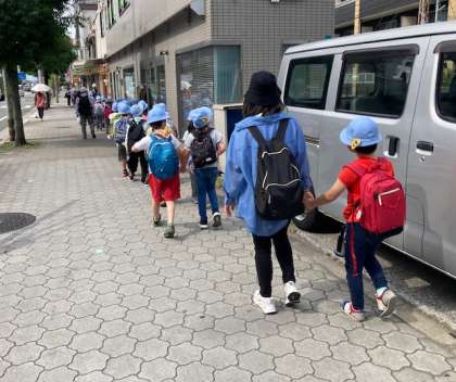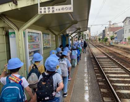 雨で延期になっていた1年生の遠足に行きます。阪堺電車に乗って浜寺公園に行きます。小学校で初めての遠足です。63人全員が学校を出発して、松虫駅に到着しました。