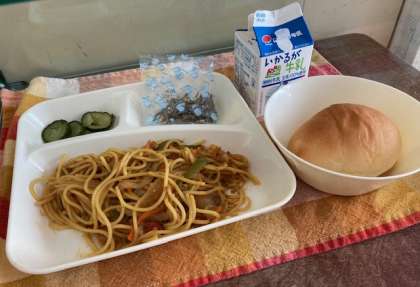 献立は、カレースパゲッティ、きゅうりのピクルス、ミニフィッシュ、ミニコッペパン、牛乳です。