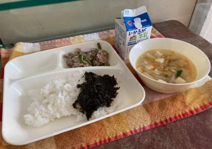 献立は、豚肉の梅風味焼き、五目汁、海苔の佃煮、ご飯、牛乳です。6月は食育月間です。食についていろいろ考えてみましょう。
