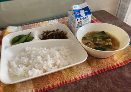 献立は、チンジャオニューロウスー、中華みそスープ、えだまめ、ご飯、牛乳です。