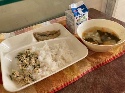 献立は、いわしの天ぷら、五目汁、とりなっ葉いため、ご飯、牛乳です。