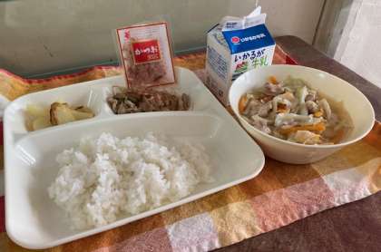 献立は、ゴーヤチャンプルー、かつおぶし、五目汁、あげ焼きじゃが、ご飯、牛乳です。にがうり(ゴーヤ)は夏が旬の野菜です。