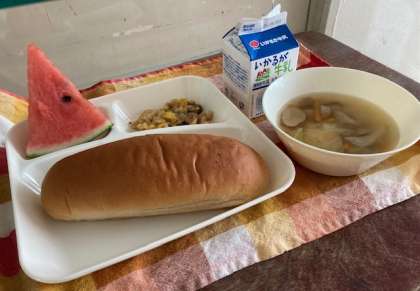 献立は、チキンパエリア、ウィンナーとキャベツのスープ、スイカ、黒糖パン、牛乳です。夏においしくなるすいかは、1年に1回.給食に出ます。すいかは、ビタミンやミネラルも多く、疲れをとり、体の調子を整えてくれます。