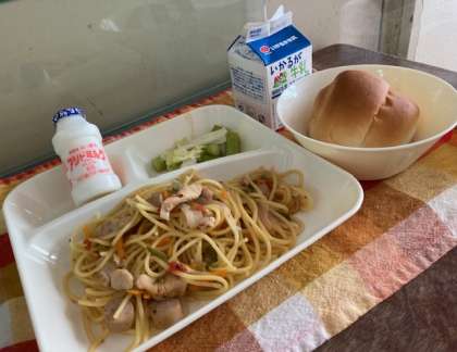 献立は、チキントマトスパゲティ、グリーンアスパラガスとキャベツのサラダ、発酵乳、ミニコッペパン、牛乳です。