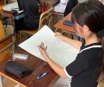 図画工作は文房具の形を活かして恐竜を描きました。とても独創的な恐竜ができあがりそうです。