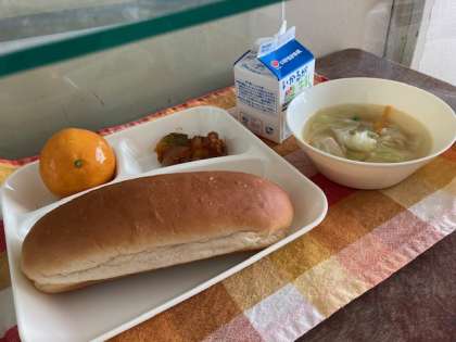 献立は、かぼちゃのミートグラタン、鶏肉と野菜のスープ、冷凍みかん、黒糖パン、牛乳です。