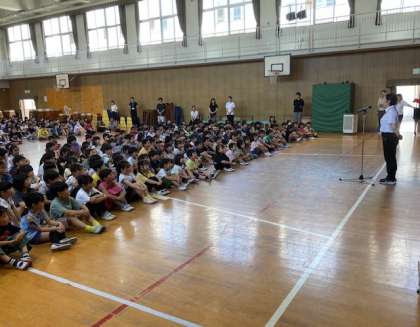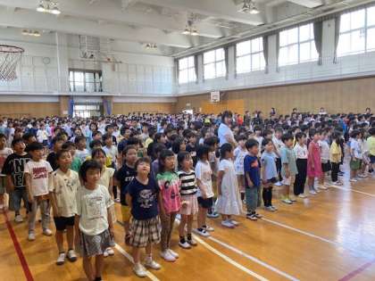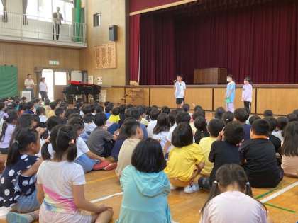 1学期終業式を体育館で行いました。2学期から他校へ転勤する先生の挨拶がありました。ミニバスケットボールクラブの表彰の後、校長先生からは「夏休みは912時間あります。目標を決めて過ごしましょう。笑顔で過ごしましょう」と、お話がありました。その後、5年生の代表児童3名が1学期がんばったことや2学期がんばることを発表しました。
