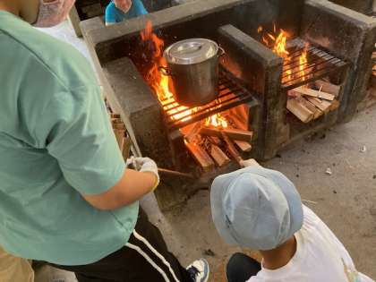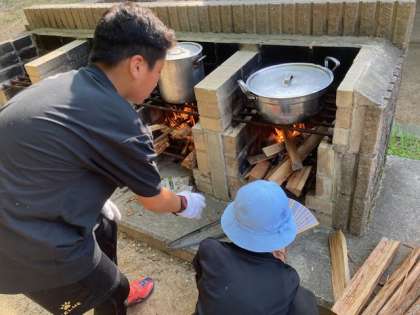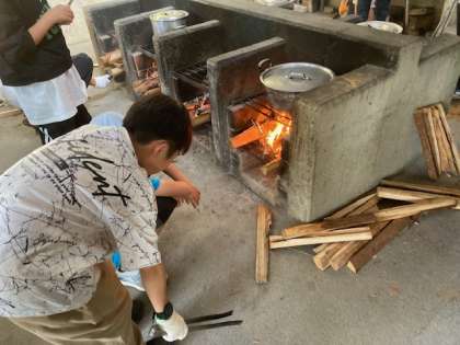かまど担当は火をおこし、その後も火が弱くならないように木を入れています。