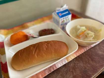 献立は、焼きハンバーグ、ケチャップ、豆乳スープ、冷凍みかん、黒糖パン、牛乳です。