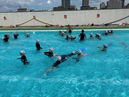 2年生がビート板、フープ、ブロックや棒、汽車ぽっぽ、水かけ修行、シャワーあそびなどのコーナーをサーキットしました。とても楽しく水遊びができました。