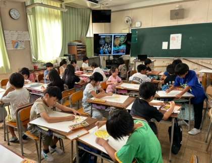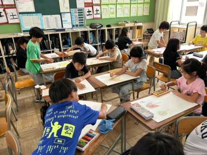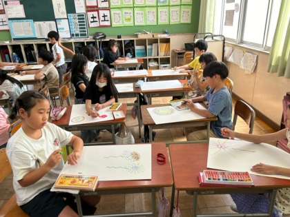 ? 3年生がパスで花火を描きました。5年生は綿棒に絵の具をつけ点描で花火を描いています。5年生とは違ったきれいな花火を描いています。完成が楽しみです。