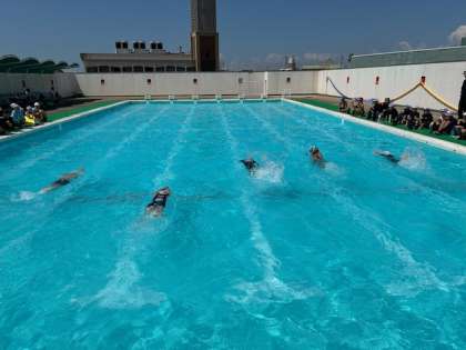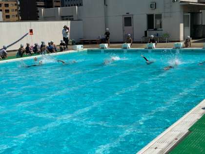 3年生が水泳学習のまとめをしました。どこまで泳げるようになったか、記録をとりました。見ている児童は応援をし、25mを泳げた児童には拍手喝采でした。