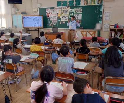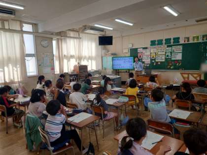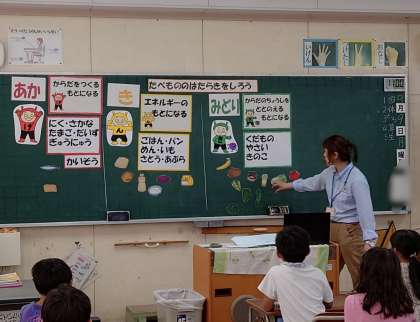 区内の栄養教諭の方に来ていただいて、2年生に栄養教育をしてもらいました。テーマは、食べた物のはたらきを知ろうです。赤、黄、緑の3色に分けられた食べ物のはたらきを学びました。