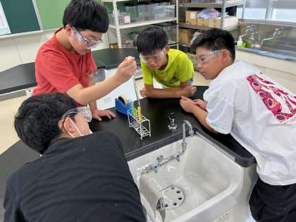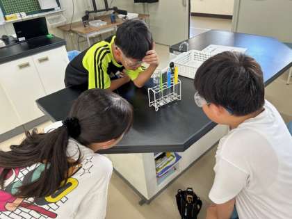 理科室で実験「金属にうすい塩酸を加えるとどうなるか」をしました。鉄としてスチールウール、アルミニウムとしてアルミホイルを使って、うすい塩酸を加えました。スチールウールはうすい塩酸を入れると、すぐにあわが出て反応しました。