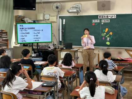 区内の栄養教諭の方に来ていただき、「野菜を食べよう」を学習しました。最初に、給食によく出る野菜の名前を書いてビンゴゲームをしました。そのあと、野菜を緑黄色野菜とその他の野菜に分類しました。
