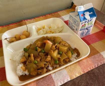献立は、チキンカレーライス、キャベツとコーンのサラダ、さくらんぼ缶詰、牛乳です。明日13日は、月見行事こんだて給食です。お楽しみに。
