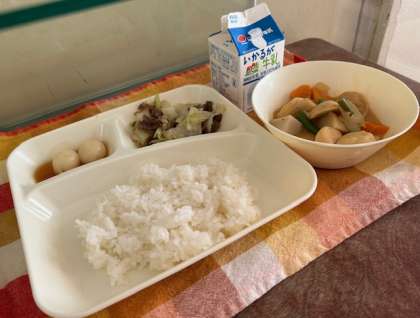 献立は、一口がんもとさといものみそ煮、牛肉と野菜のいためもの、みたらしだんご、ご飯、牛乳です。