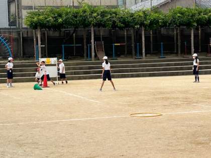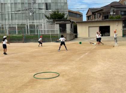 5年生の体育はティーボールです。ティーボールとは、ピッチャーのいない野球です。打者は止まっているボールを打ち、一塁へ走ります。ボールとバットが柔らかいので安全です。ティーボールは誰でもフェアグランドに打てますので、楽しくゲームができます。