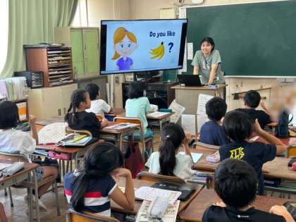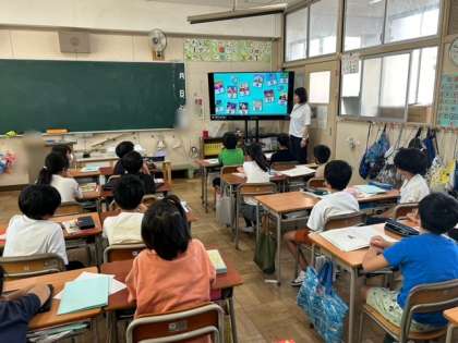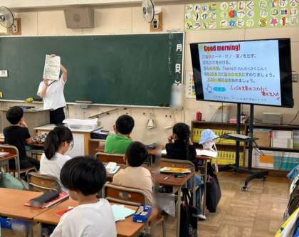 子どもたちは登校後、8時30分までにすることが大型テレビに映し出されていますので、それに従って準備をしています。今日はイングリッシュタイムなので、10分間の外国語活動をしました。