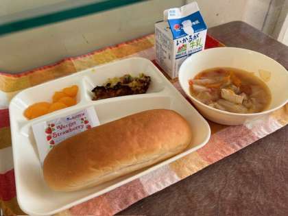 献立は、カレーマカロニグラタン、トマトスープ、みかんの缶詰、コッペパン、いちごジャム、牛乳です。
