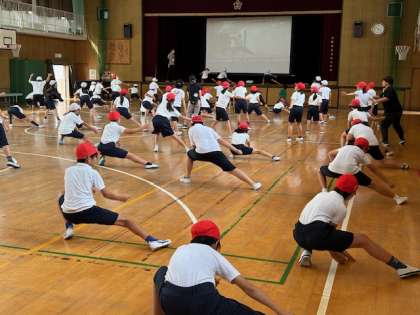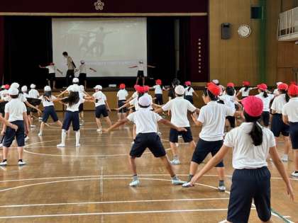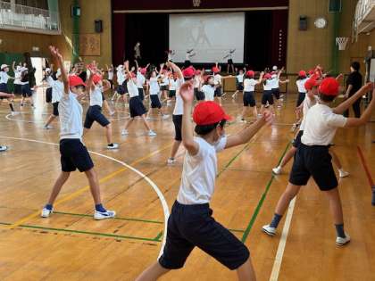 運動会練習が始まりました。5年生は団体演技で南中ソーランをします。体育館で映像を流し、実行委員のメンバーが前で踊り、みんなで南中ソーランの練習をしました。一生懸命に振り付けを覚えています。