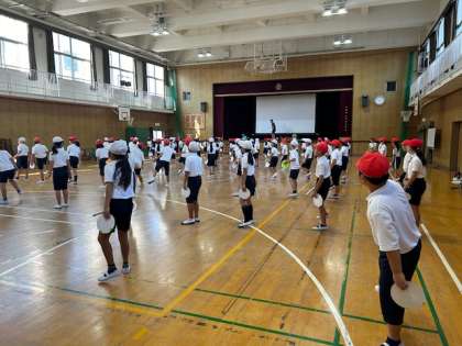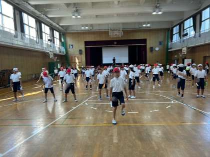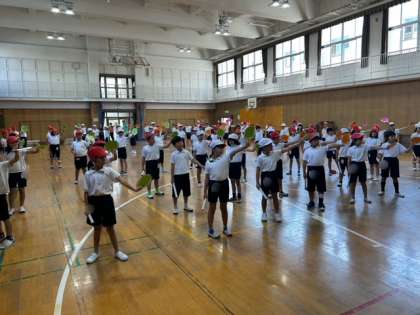 4年生が体育館で運動会の団体演技の練習をしました。団体演技はエイサーをします。画用紙で作ったパーランを持ち、振り付けを覚えました。