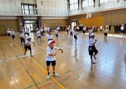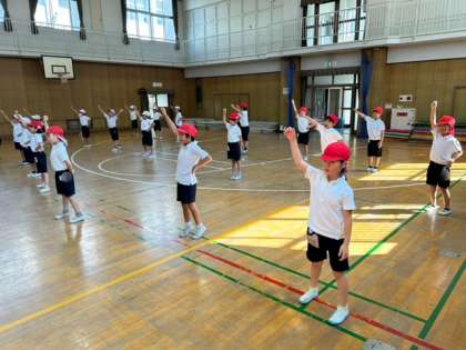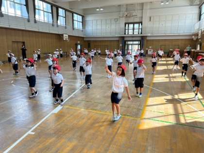 1年生が運動会の団体演技の練習をしました。音楽に合わせて踊るリズムダンスです。舞台でダンスする先生のまねをして、覚えています。