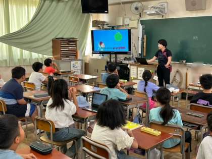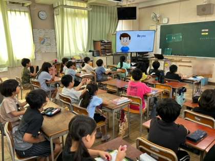 3年、4年、5年生のイングリッシュタイムの様子です。週2回、1回10分間ですが英語に触れ合っています。1年生から積み上げると、力がつきます。